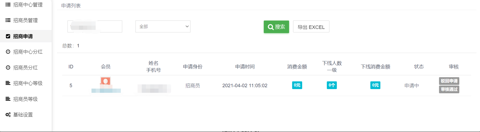 2)申请:会员申请,后台通过审核后即可成为招商员;