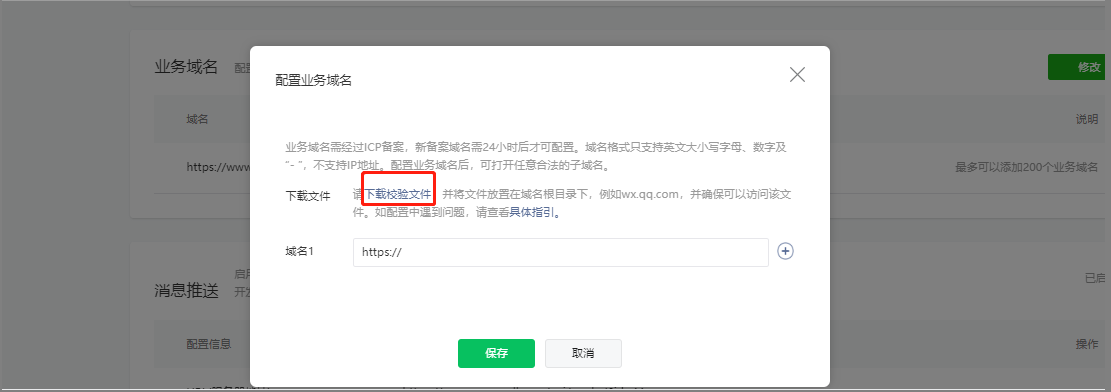 2、要保存业务域名,先下载校验文件,添加哪个站点域名就将业务域名的校验文件上传到那个站点的网站根目录