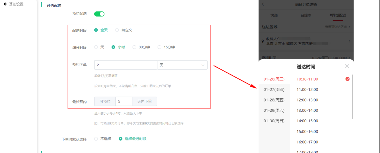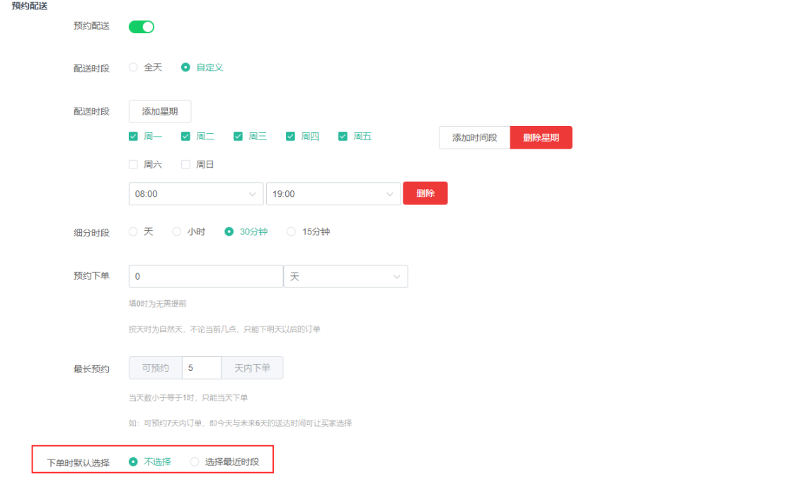 配送时段:可以设置按全天或者一个星期每天的配送时段,细分时段,按天,小时,30分钟,15分钟来设置