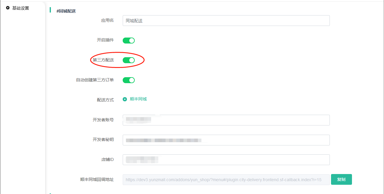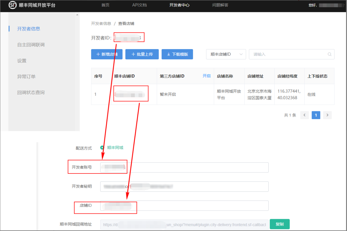将第三方开放平台的:开发者信息--->店铺--->开发者ID、店铺ID复制到同城配送插件