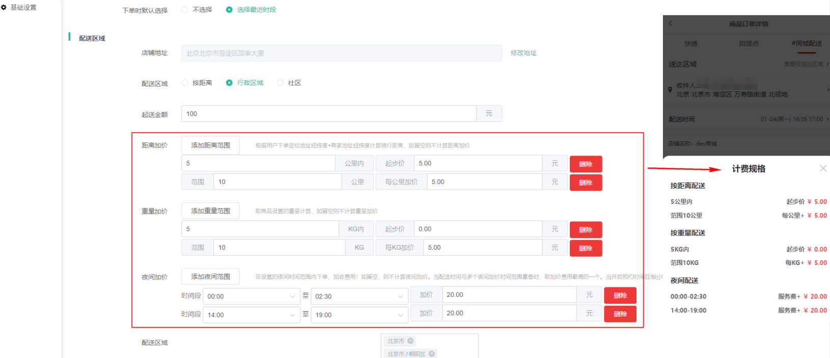 按距离:按距离店铺地址的远近设置配送费用,可设置起送价和阶梯运费