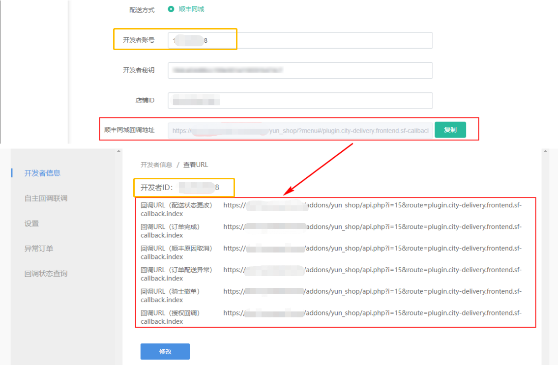 将同城配送插件的回调地址复制到:开放平台--->开发者信息--->-url