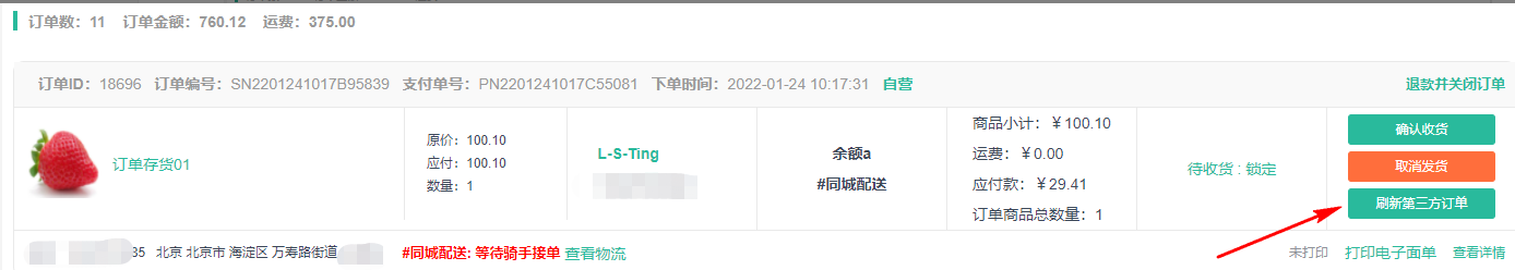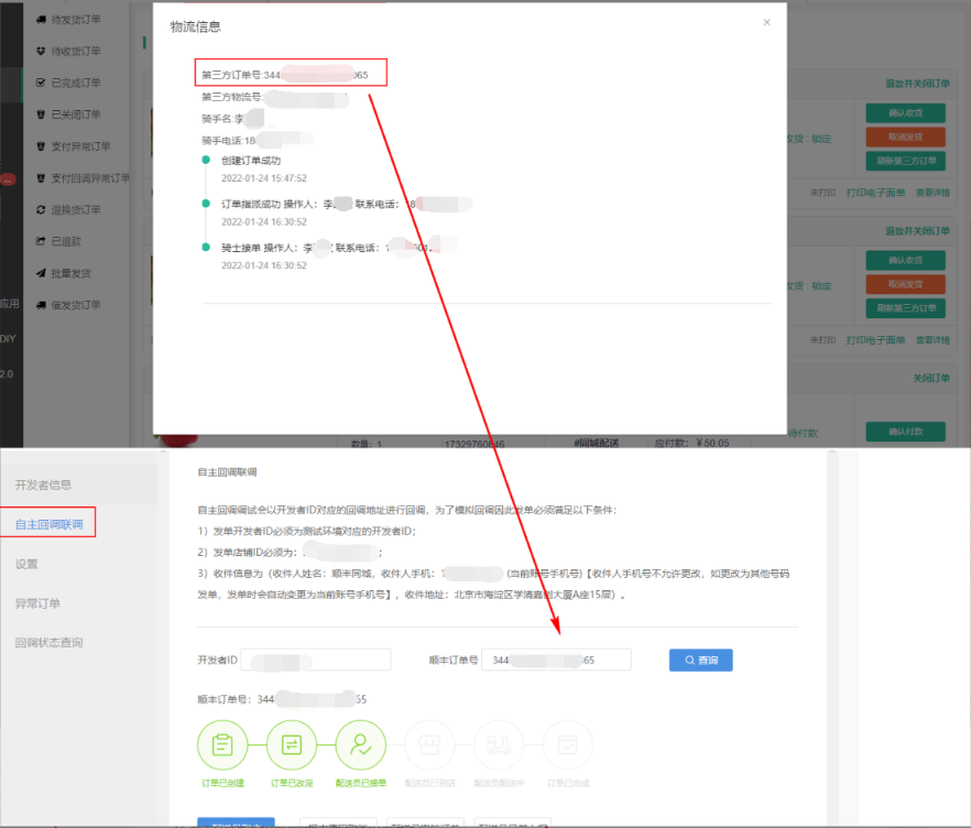 点击查看物流,复制第三方订单号到第三方平台查询订单,修改配送状态,第三方配送状态与商城订单物流信息同步,则回调正常