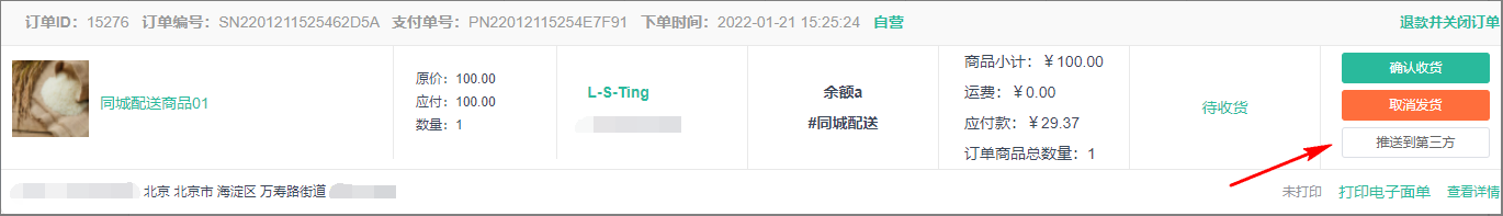 若对接第三方配送,订单将自动同步到第三方平台,由第三方平台负责配送,会员在前端也可看到订单的配送进度