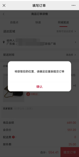 1、预下单页--未填写经纬度会有弹窗确认时同时获取经纬度