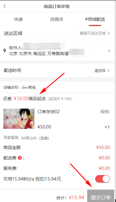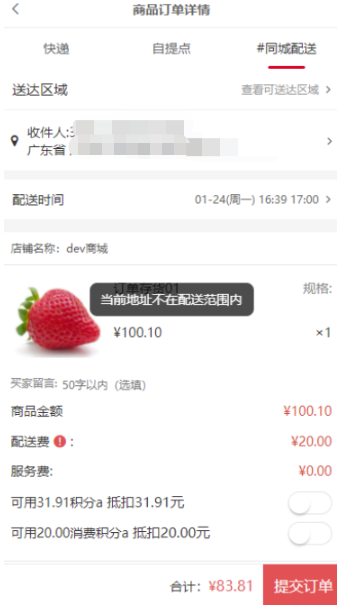 若后台选择自动创建第三方订单,当会员在(平台自营商品)预下单时选择同城配送,商家可以接入第三方配送也可以选择自己配送。