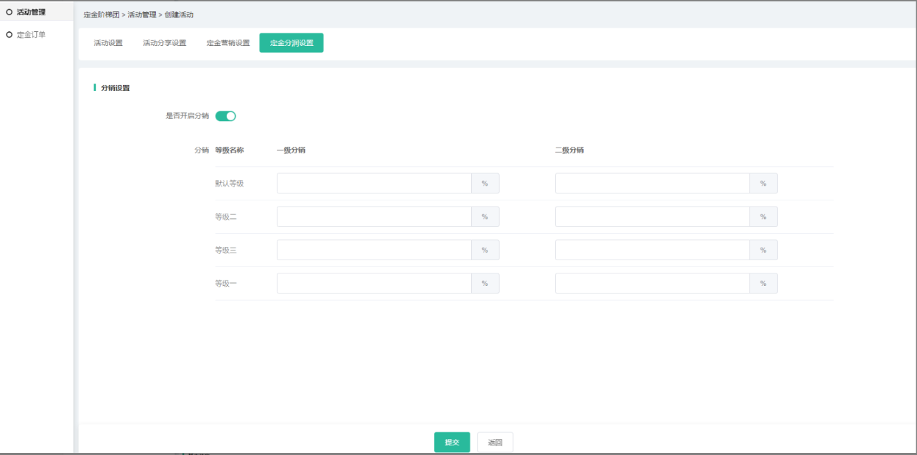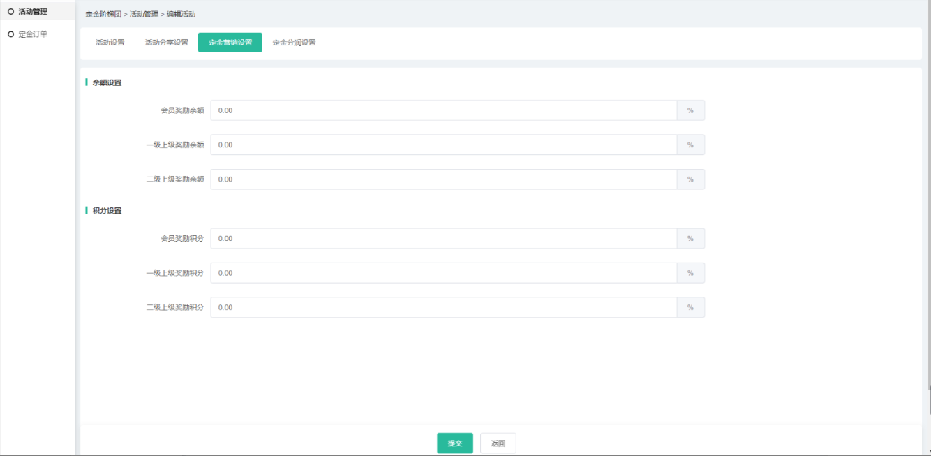 (4)营销设置和分润可设置活动定金的营销及分润信息,相应插件如未开启,则无法 设置,分润中所有插件都没开启则不会有分润设置导航;