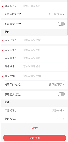 (5-1)基本信息:商品图片、其他图片、商品详情、商品名称、商品分类、商品类型、商品单位、商品现价、商品原价、商品成本、商品库存、减库存的方式、是否可退货退款、运费设置、配送方式