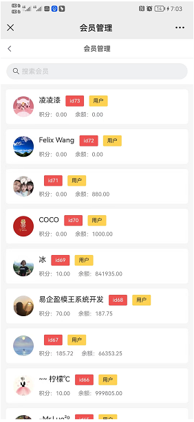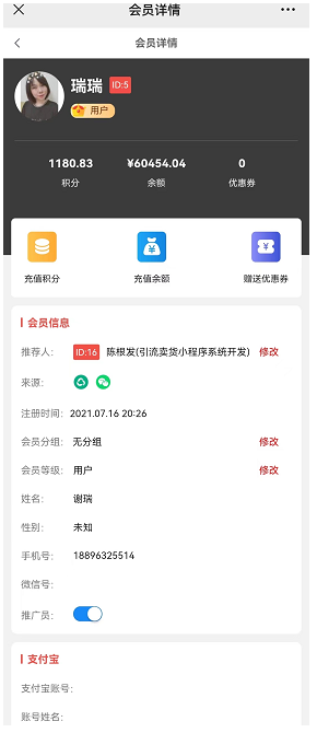 (2)会员信息:积分、余额、优惠券、推荐人、来源、注册时间、会员分组、姓名、性别、手机号、微信号、是否推广员、支付账号信息等