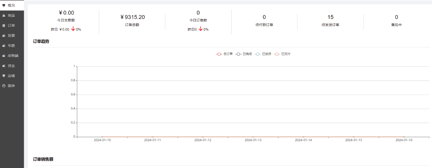 显示当前供应商的今日交易额、会员总额、今日订单数、待付款订单数、待发货订单数、售后中订单数、7日内订单趋势和订单销售额图;