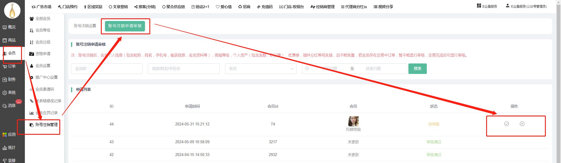 3.后台管理员:后台--会员---账号注销管理--账号注销申请审核--选择勾选即该账号被注销掉