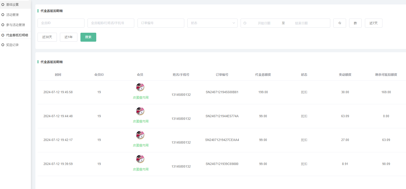 1,新增活动:设置活动名称、消费区间金额、代金券金额、每次抵扣金额、奖励金额