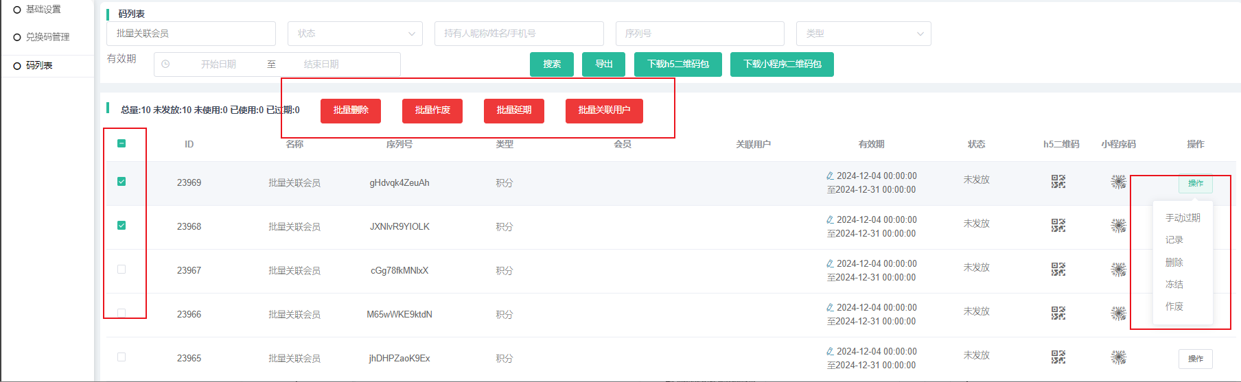2、显示名称,序列号,类型,会员,有效期,状态,h5二维码,小程序码,操作【可设置手动过期,记录,删除】,支持批量删除、作废、延期和关联用户功能