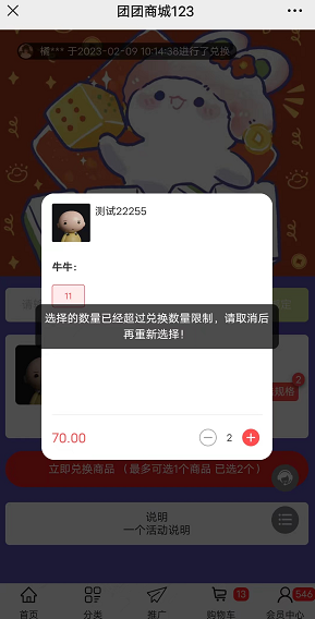 累计选择的商品数量超过兑换码兑换商品数量的,弹窗提示:选择的数量已经超过兑换数量限制,请取消后再重新选择!