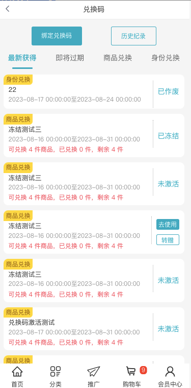 2、未使用:兑换码方法给具体的会员或者被会员绑定,但是未兑换;