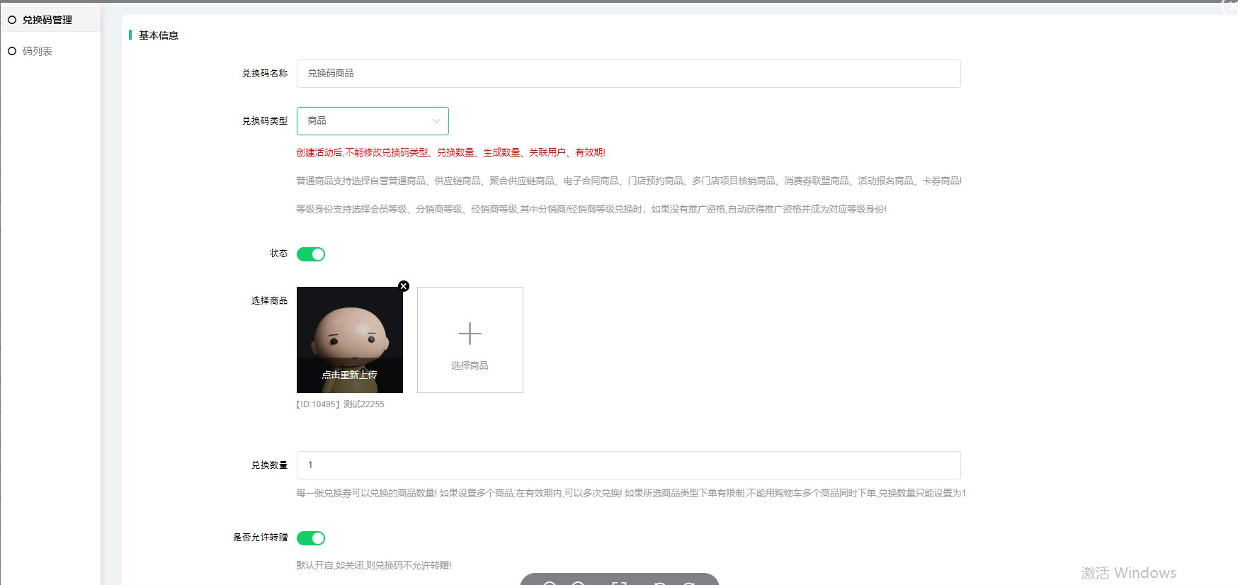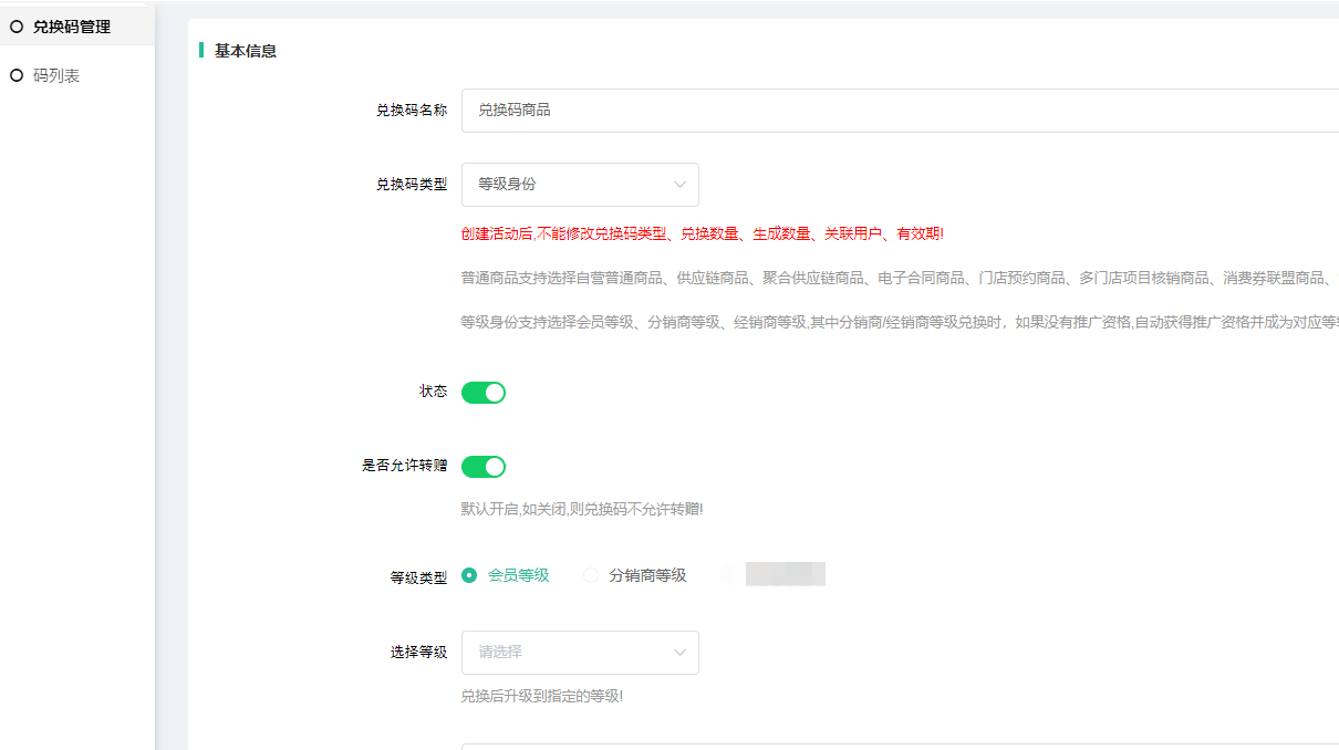 是否允许转增:默认开启,如关闭,则兑换码不允许转赠!