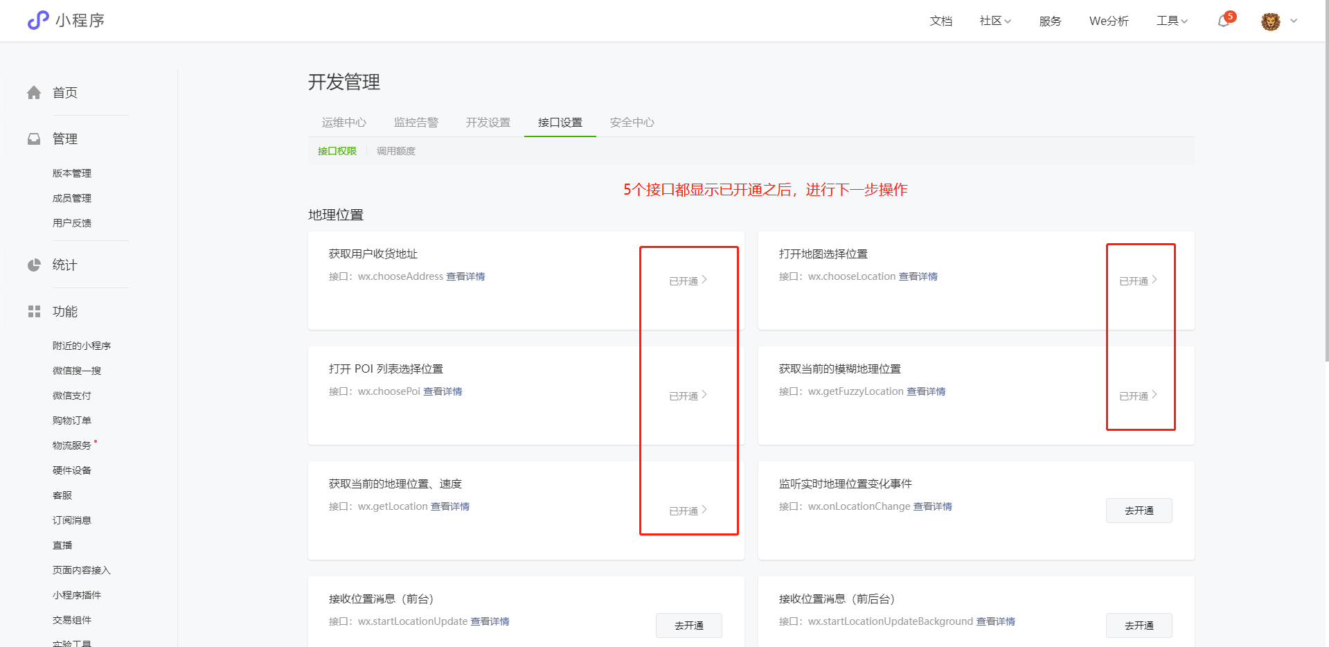 9:小程序后台-开发管理-接口设置处申请开通接口(申请原因如下)