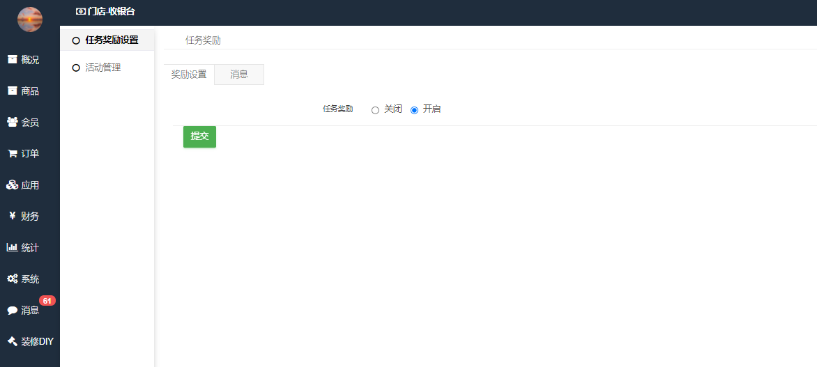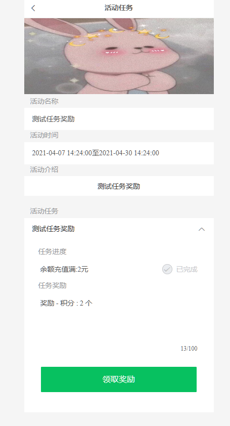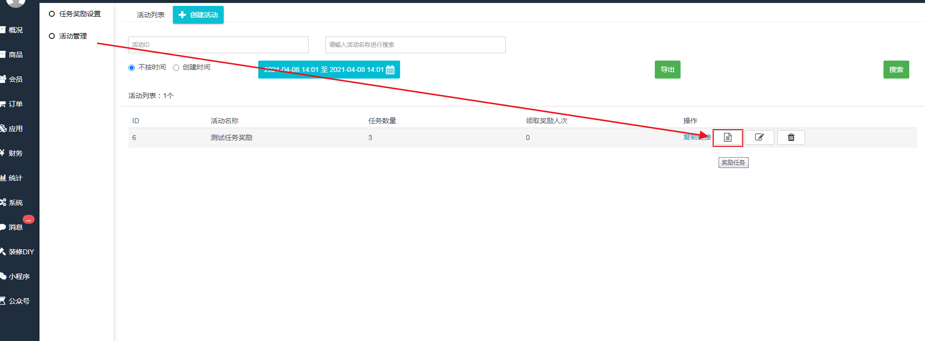 任务奖励:后台创建活动,活动里添加任务,满足任务设置的条件就可以获得奖励,奖励需要到前端会员中心领取。