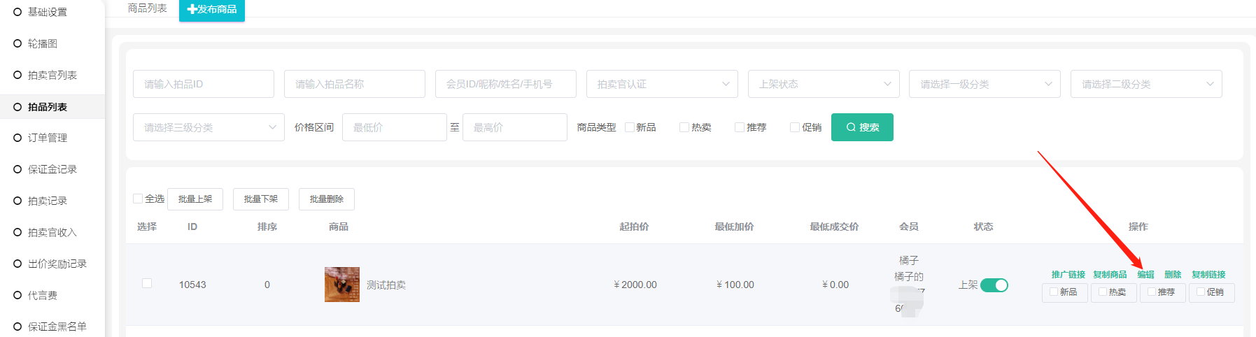 2、可以按拍品ID(拍品ID搜索框可按商品名称搜索商品 )、会员ID昵称/姓名/手机号、拍卖官认证、上架状态、商品分类、价格区间、商品类型,搜索查看商品;