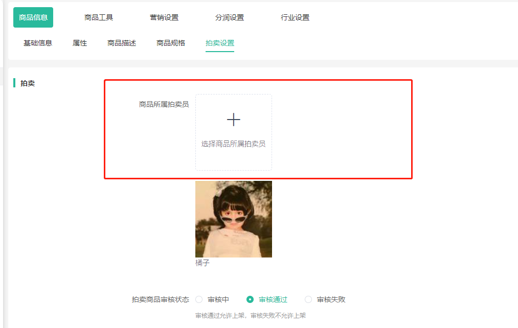 2、选择拍品所属拍卖员,后台发布商品必须添加拍卖员,商品将显示在前端该拍卖员的店铺