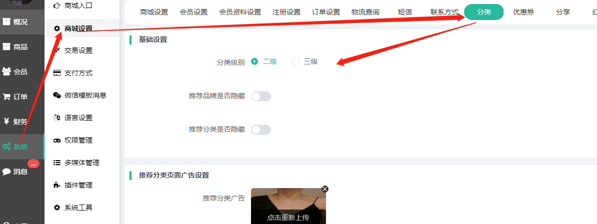 商品支持二级、三级商品分类,需在系统-商城设置-分类中选择分类级别;