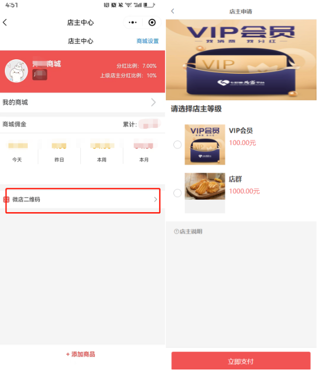 会员购买指定开店产品,成功付款后便会成为微店店主,永久的。若付款订单有申请退款,并退款成功,只能将微店加入黑名单,加入黑名单后,微店店主无法进入微店店主中心,提示“微店已被禁用”,可以分享微店首页锁客,但无法再获得微店分红。